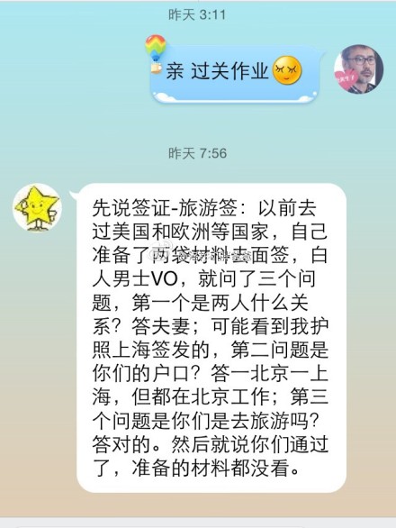 以前,我去过美国和欧洲等国家,自己准备了两袋材料去办理赴美签证,签证官是一个白人签证官,就问了三个问题,第一个是两个人是什么关系?我们回答说是夫妻。可能是看到我护照是上海签发的原因,第二个问题是你们的户口?我说北京,上海,但都是在北京工作的。第三个问题是你们是去旅游吗?我回答说是的。然后就说你们通过了,准备的材料也都没有看。