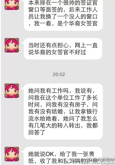 孕妈:本来排在一个很帅的签证官窗口等面签,后来工作人员让我换了一个没人的窗口,我一看,是个华裔女签证官。