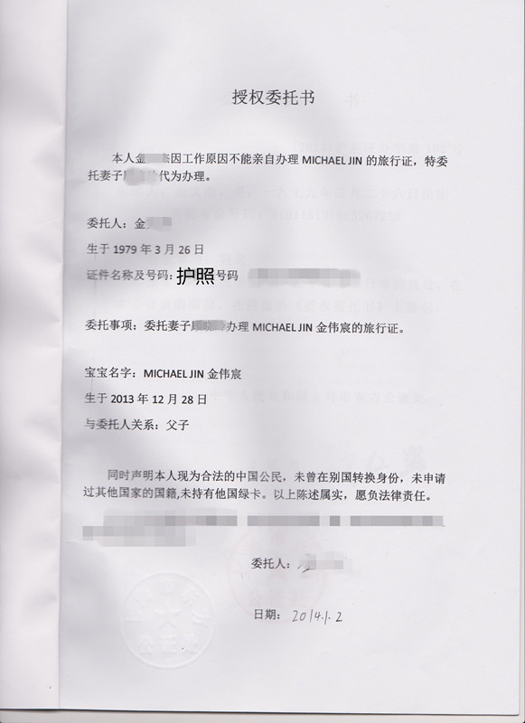 如果老公不能来美国,需要办理一份同意书(即3053表格),给宝宝申请护照时使用;需要办一份委托书,给宝宝申请中国旅行证时使用。这两份文件都需要公证,都是1式1份即可。