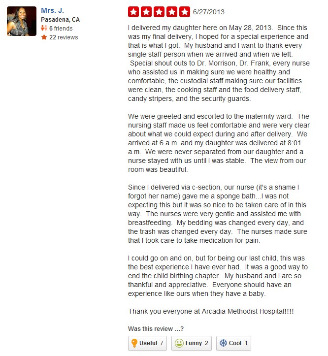 2013年5月28日,我在美以美医院生下我的小女儿。虽然这是我最后一次生育,但我仍然希望能够拥有一次特别的经历,而且我得到了!我和我丈夫想要去感谢医院的每一位工作人员,特别提出来的是Morrison医生和Frank医生,以及每一位为我们提供帮助的护士,她们保证了我们在医院的时候能够健康舒适。感谢医院的监护人员,是他们保证了设备干净整洁,感谢医院的厨师,是他们让我们每一顿饭都那么可口。感谢保安,为我们提供一个安全的环境。