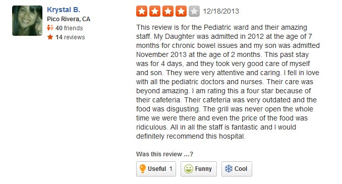 2012年,我女儿7个月大时,因慢性肠道炎住进怀特纪念医院。2013年11月,我两个月大的儿子也住进了这家医院。我们在医院待了4天,他们非常细心地照顾了我和我的儿子。